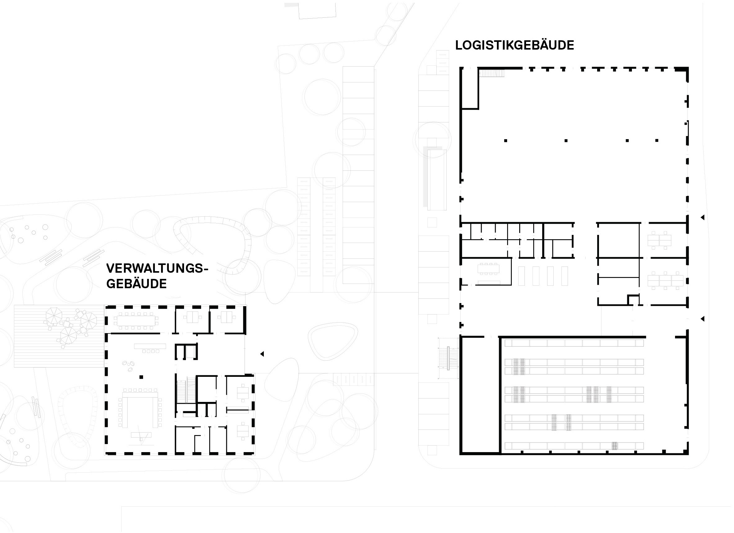 Infrastruktur, Verkehrsflächen und Außenanlagen. Sämtliche Neubauten wurden in Holzbauweise ausgeführt; das Verwaltungsgebäude nimmt hierbei eine exemplarische Rolle als Holz-Hybridbau ein. Das städtebauliche Konzept orientiert sich an einer campusartigen Struktur mit kurzen, direkten Wegen, die eine flexible Erweiterbarkeit ermöglichen.