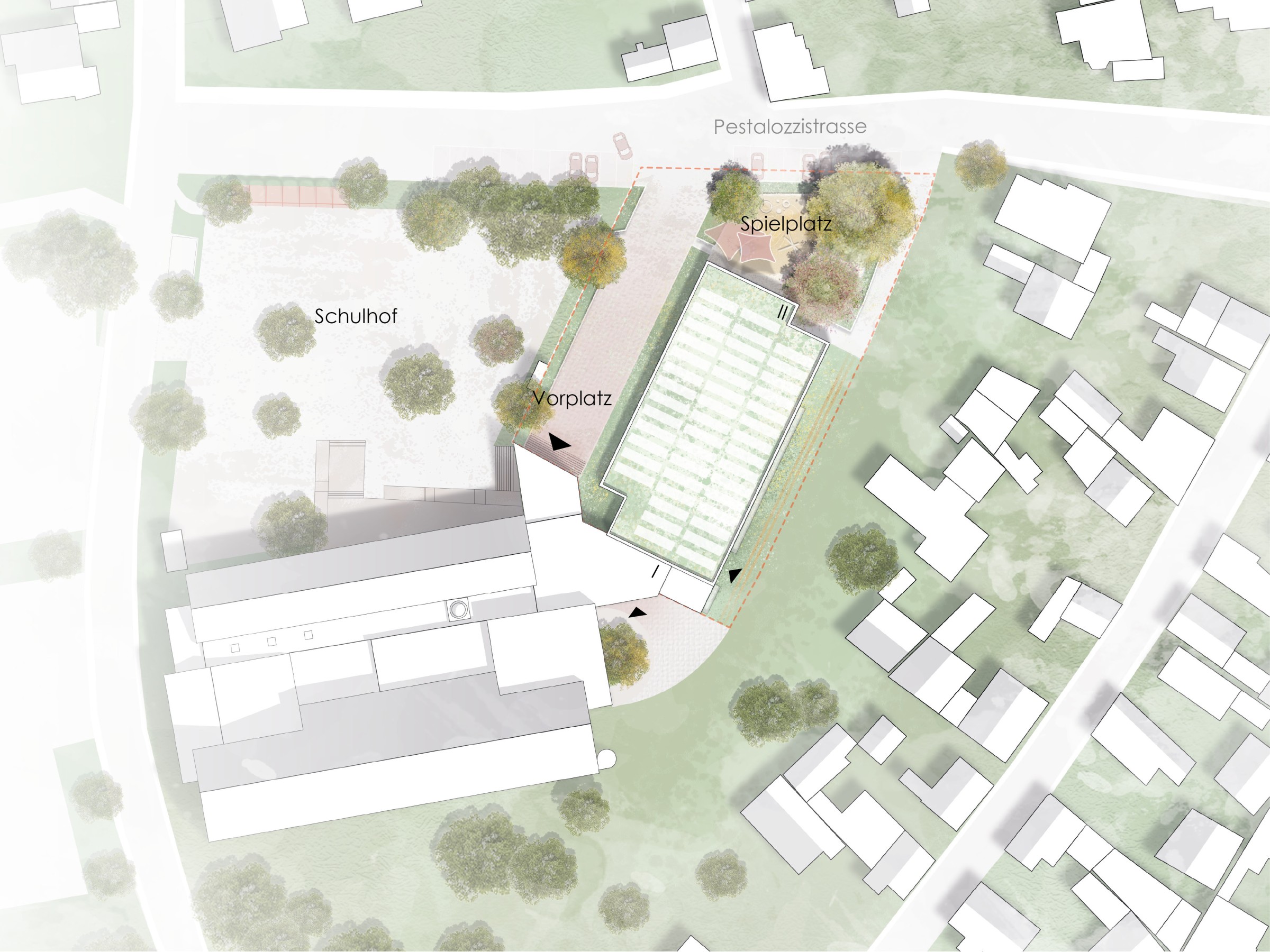Die Erweiterung der Leimbachtalschule setzt auf einen sensiblen Umgang mit dem Bestand und nutzt den vorhandenen Fußabdruck des bestehenden Schwimmbads als Grundlage für die bauliche Entwicklung. Durch die Aufstockung entsteht ein klar ablesbarer neuer Baustein, der das Schulareal ergänzt und einen identitätsstiftenden Auftakt für den Standort bildet, ohne die bestehende Organisation des Geländes zu verändern. Die Erschließung der Schule bleibt weiterhin über die bestehende Feuerwehrzufahrt erhalten und gewährleistet eine funktionierende und vertraute Zugangssituation. Die bauliche Erweiterung wird als leichter Holzskelettbau auf die vorhandene Tragstruktur gesetzt. Diese Konstruktion minimiert zusätzliche Lasten und ermöglicht einen ressourcenschonenden Umgang mit der bestehenden Bausubstanz, sodass auf eine zusätzliche Gründung verzichtet werden kann. Gleichzeitig entstehen moderne, flexible Lernräume, deren Realisierung die Nutzung des Bestands während der Bauphase weitgehend ungestört lässt.KENNDATEN