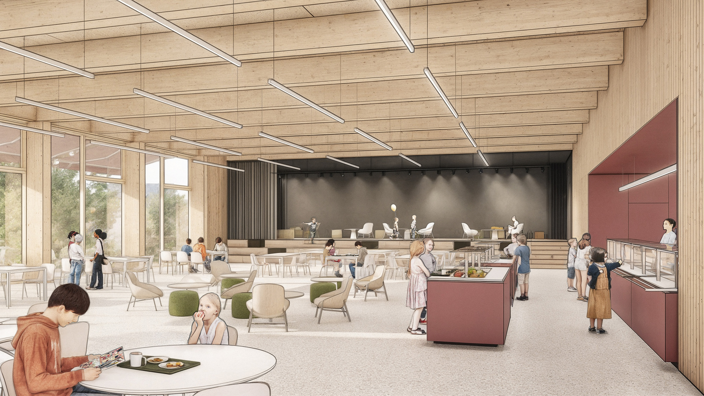 Zwischen den vorhandenen, heterogenen Stadtstrukturen kann sich der Entwurf frei und eigenständig behaupten. Ein Zusammenspiel aus Bauteilgliederung, Baukörperstellung und Geländekanten bildet sowohl introvertierte, als auch einladende Freiräume aus. Es entstehen geschützte Spielhöfe und ein von Weitem einsehbarer Vorplatz, an dem die Kinder gebracht und abgeholt werden können. Klar wird die Kindertagesstätte in drei eingeschossige und in seiner Körnung wohltuende Baukörper unterteilt. Diese Gliederung spiegelt die innere und einfache Grundaufteilung wider. Kinderkrippe und Kindergarten befinden sich in einem jeweils eigenen Baukörper und werden durch den zentral liegenden Gemeinschaftsbereich miteinander verbunden.Kenndaten