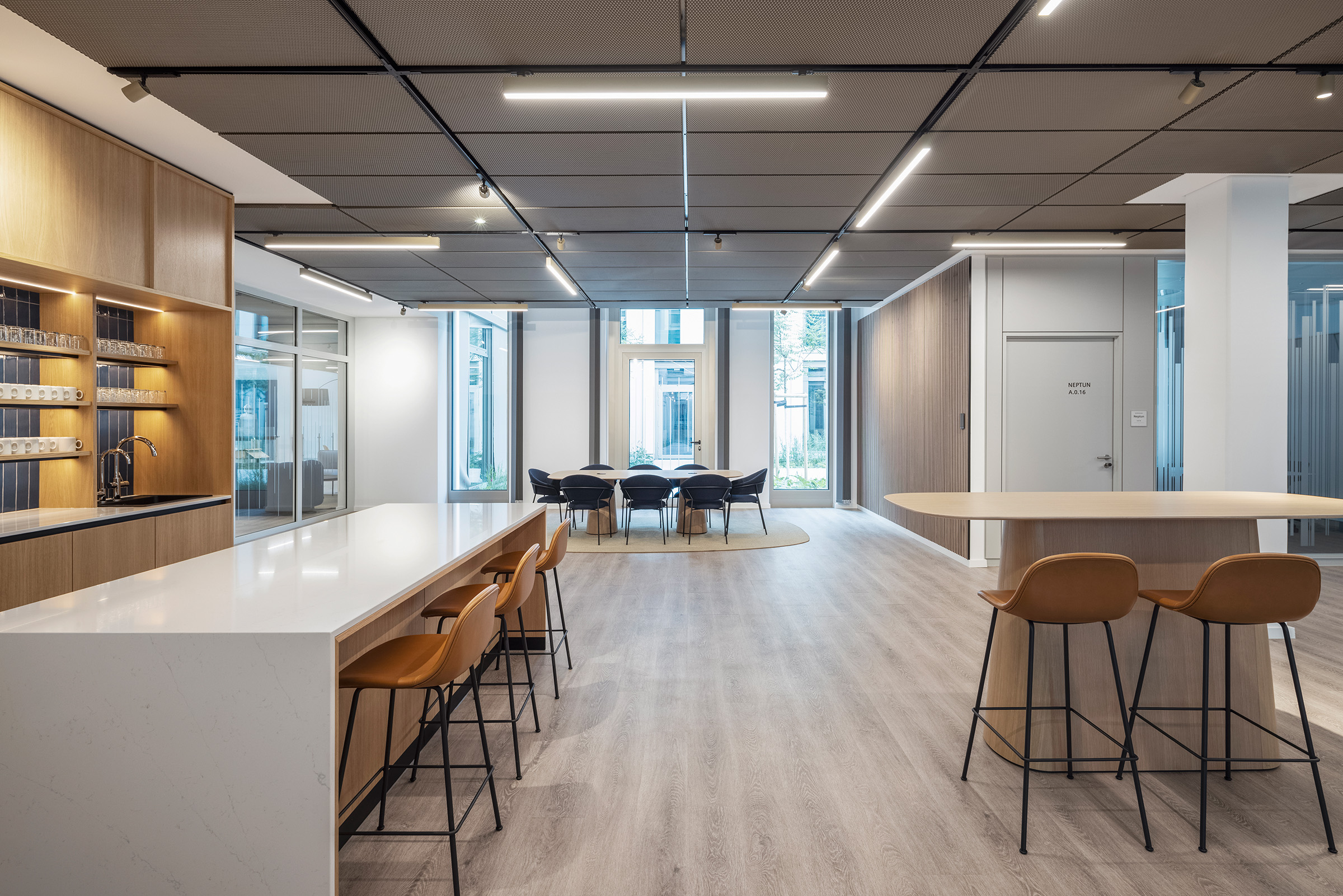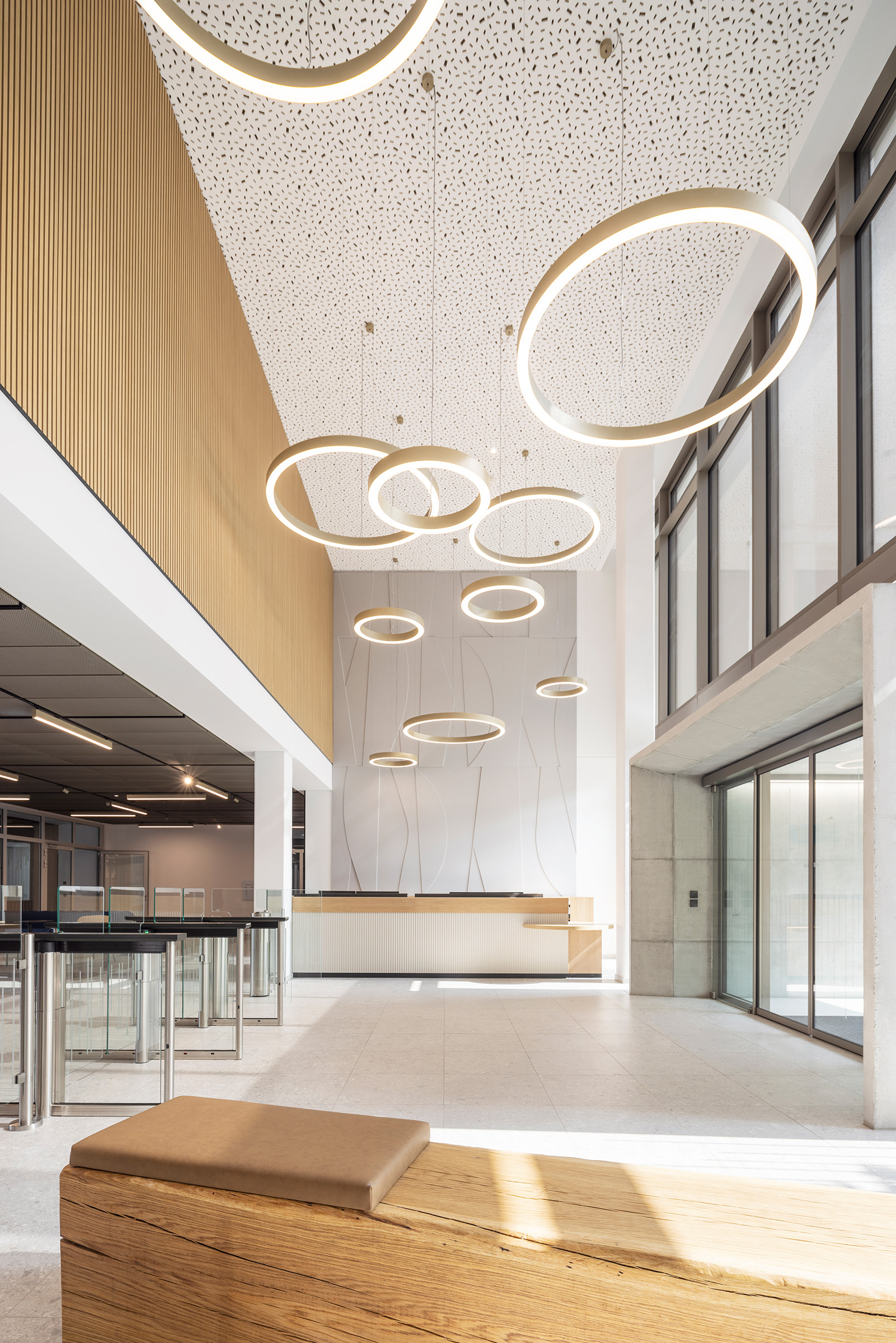 Innerhalb der Mietflächen sorgt eine hocheffiziente Hybridlösung zwischen recycelbaren Metalldecken in Verbindung mit Heiz- und Kühlregistern für ein angenehmes Raumklima.