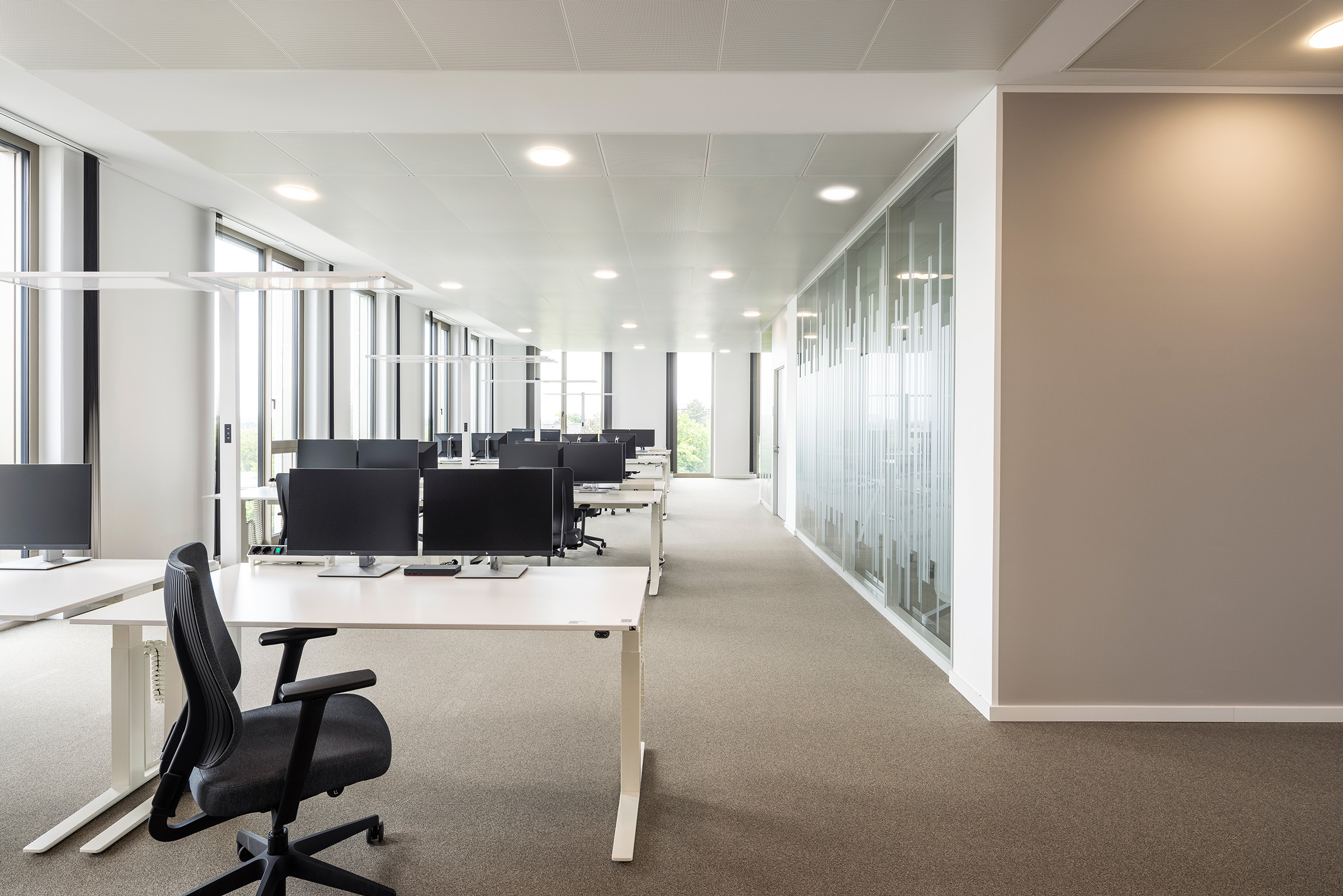 Die Nutzflächen verfügen über eine kontrollierte Be- und Entlüftung mit integrierter Wärmerückgewinnung. Präsenzgeber und Sensortechnik sind dafür verantwortlich, dass Heizung, Klimaanlage, Lüftung sowie Beleuchtung nur bei Bedarf in Betrieb sind.