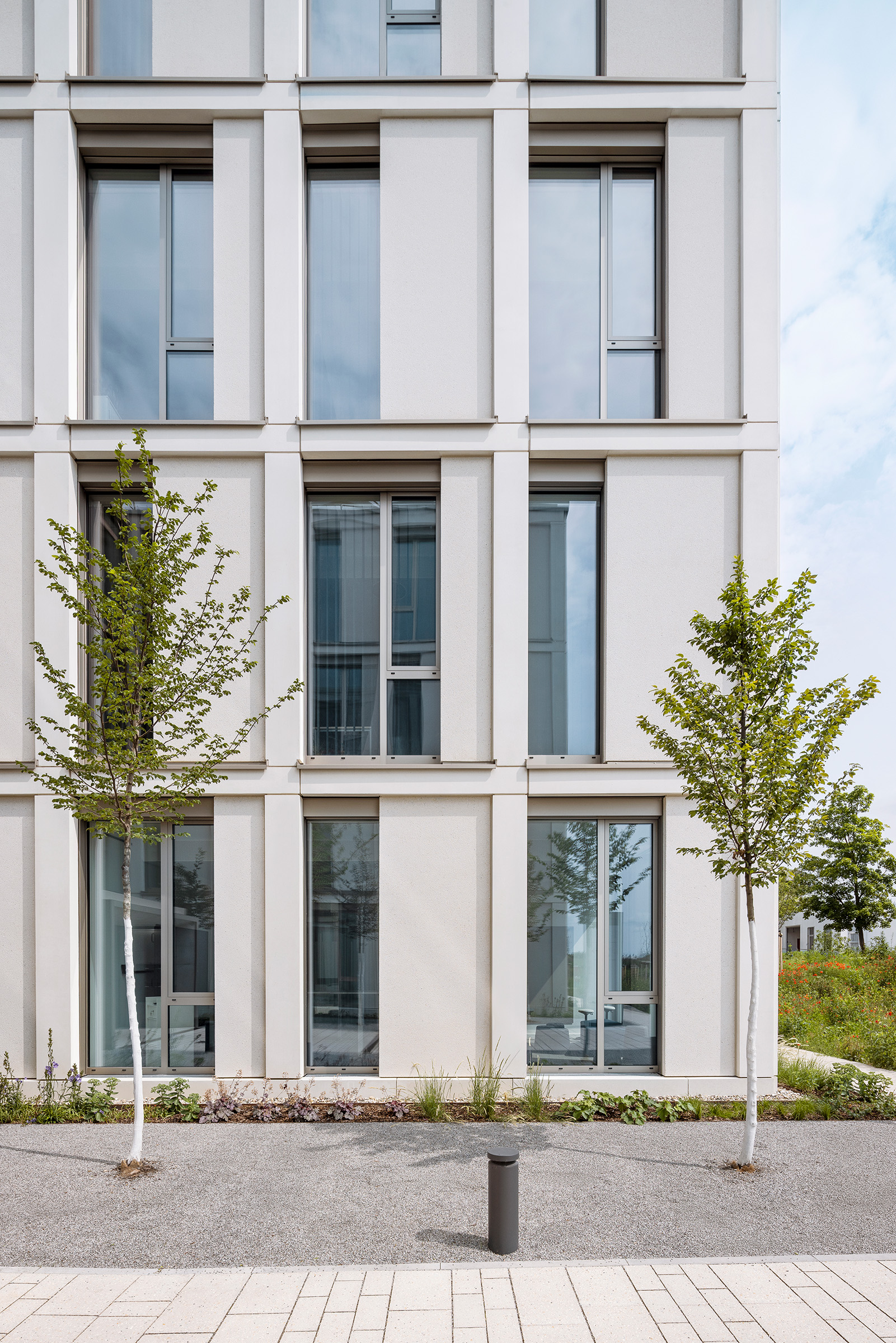 Die Fassade ist aus hochwertigem Architekturbeton in Sandwich-Bauweise errichtet. Flexibel, alle 1.35 m können im Inneren Bürotrennwände angeschlossen werden. Raumhohe Fensterelemente sorgen für ein helles und offenes Raumgefühl. Außen überzeugt die Fassade durch eine feine wie klassische Linienführung. Unterschiedlich ausgeprägte Sichtbetonflächen aus Weißzement, ob glatt geschalt oder sandgestrahlt, sorgen für eine entsprechende Wertigkeit und Beständigkeit. Fenster und Fensterbänke aus einem hell-bronzenem, eloxiertem Aluminium unterstreichen den gesetzten Anspruch an Architektur und Material.