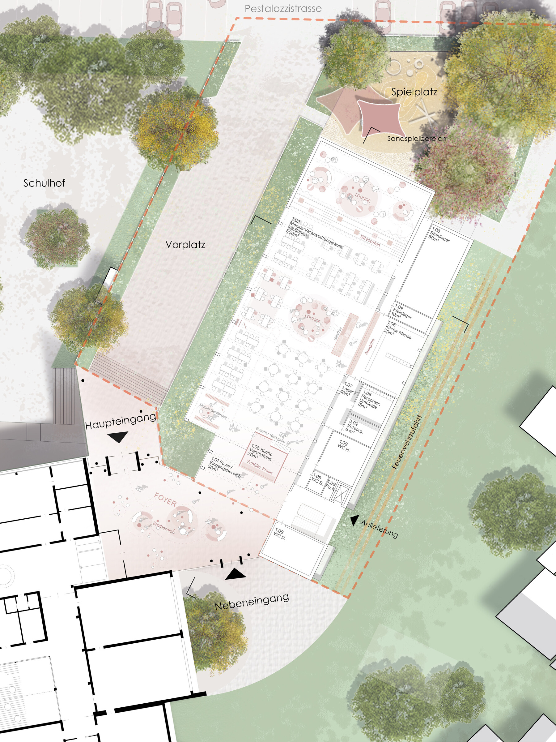 Die Erweiterung der Leimbachtalschule setzt auf einen sensiblen Umgang mit dem Bestand und nutzt den vorhandenen Fußabdruck des bestehenden Schwimmbads als Grundlage für die bauliche Entwicklung. Durch die Aufstockung entsteht ein klar ablesbarer neuer Baustein, der das Schulareal ergänzt und einen identitätsstiftenden Auftakt für den Standort bildet, ohne die bestehende Organisation des Geländes zu verändern. Die Erschließung der Schule bleibt weiterhin über die bestehende Feuerwehrzufahrt erhalten und gewährleistet eine funktionierende und vertraute Zugangssituation. Die bauliche Erweiterung wird als leichter Holzskelettbau auf die vorhandene Tragstruktur gesetzt. Diese Konstruktion minimiert zusätzliche Lasten und ermöglicht einen ressourcenschonenden Umgang mit der bestehenden Bausubstanz, sodass auf eine zusätzliche Gründung verzichtet werden kann. Gleichzeitig entstehen moderne, flexible Lernräume, deren Realisierung die Nutzung des Bestands während der Bauphase weitgehend ungestört lässt.KENNDATEN
