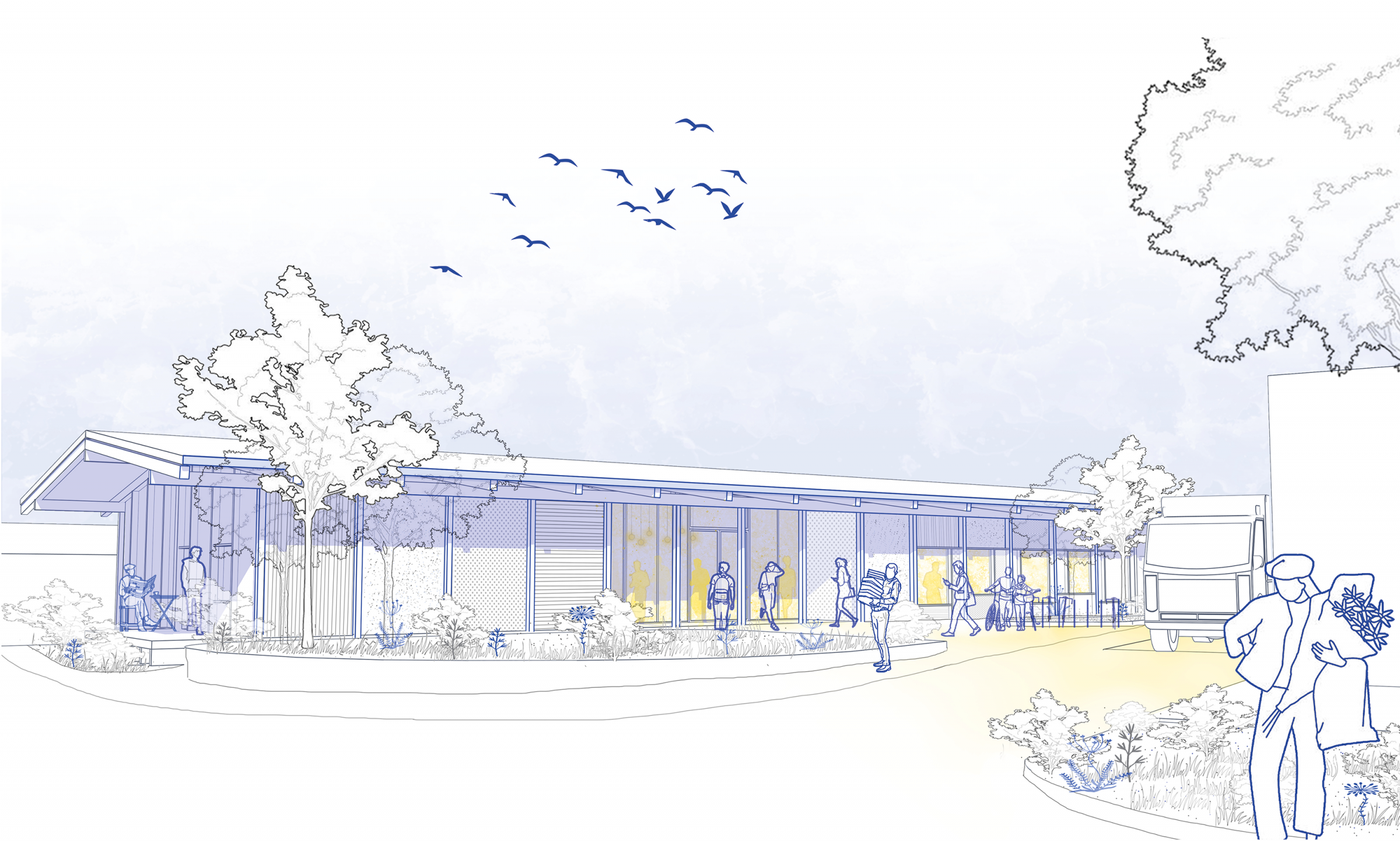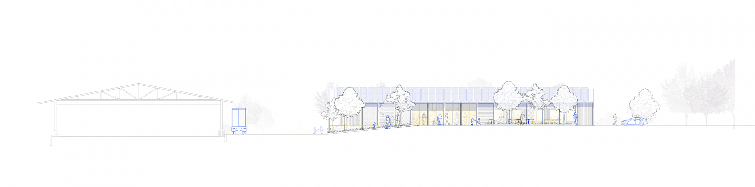 Das Gebäude überzeugt durch eine klare und verständliche Grundrissstruktur, die alle Funktionen effizient miteinander verknüpft. Das sichtbare Tragwerk in Form einer Zangenkonstruktion prägt die Architektur und macht die statische Logik unmittelbar erfahrbar. Tragende Stützen gliedern die Fassade vertikal, während das auskragende Dach eine horizontale Struktur schafft. Zwischen den Stützen entsteht eine Patchwork-Fassade aus unterschiedlichen wiederverwendeten Materialien. Die Büros werden mit gebrauchten Fenstern ausgestattet werden, die sich harmonisch in die Patchwork-Fassade einfügen.