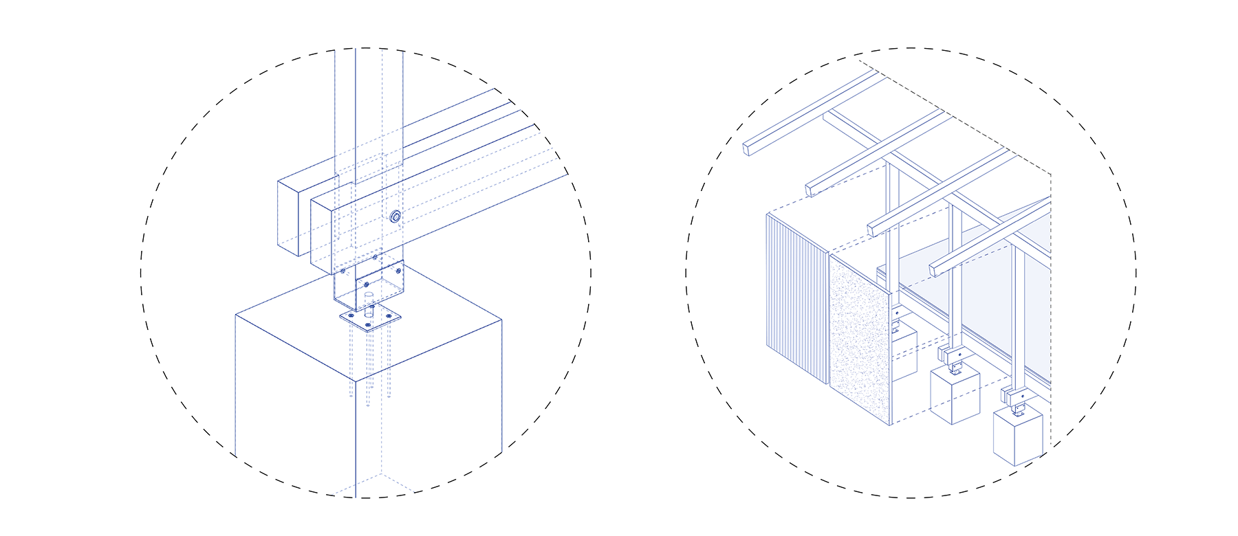 Das Gebäude basiert auf einer klaren, reversiblen Konstruktion, die ausschließlich mit lösbaren Schraubverbindungen ausgeführt ist. Es ist aufgeständert und ruht nur auf Einzelfundamenten, wodurch minimal in den Boden eingegriffen wird und gleichzeitig die Entweichung von Bodengasen gewährleistet ist. Die Bodenplatte besteht aus Holzbalken in einer Zangenkonstruktion. Das Dach ist als klassisches Satteldach mit Auskragung ausgebildet. Durch die sichtbare Tragstruktur, die modulare Bauweise und die konsequente Reversibilität werden Funktion, Ausdruck und nachhaltige Nutzung in einem klaren architektonischen Konzept vereint.Das Gebäude setzt konsequent auf nachhaltige und zirkuläre Materialien. Tragwerk, Fassaden und Ausbaukomponenten bestehen aus recycelten und wiederverwendeten Materialien aus Abbruchprojekten. Für die Dämmung wird zellulosebasiertes Material eingesetzt, das umweltfreundlich, rückbaubar und wiederverwertbar ist.Wirtschaftlichkeit, Bauökonomie und Betrieb