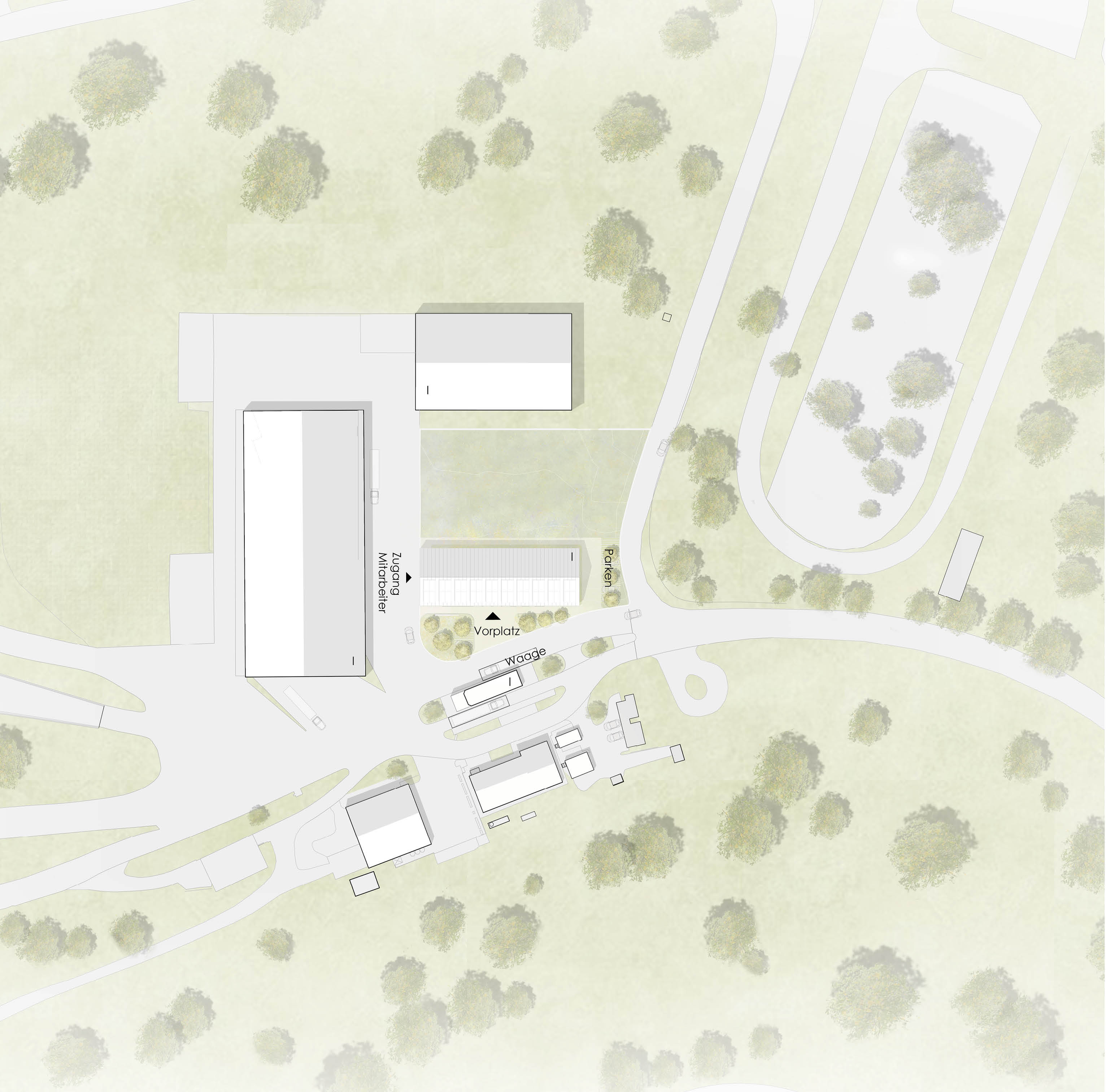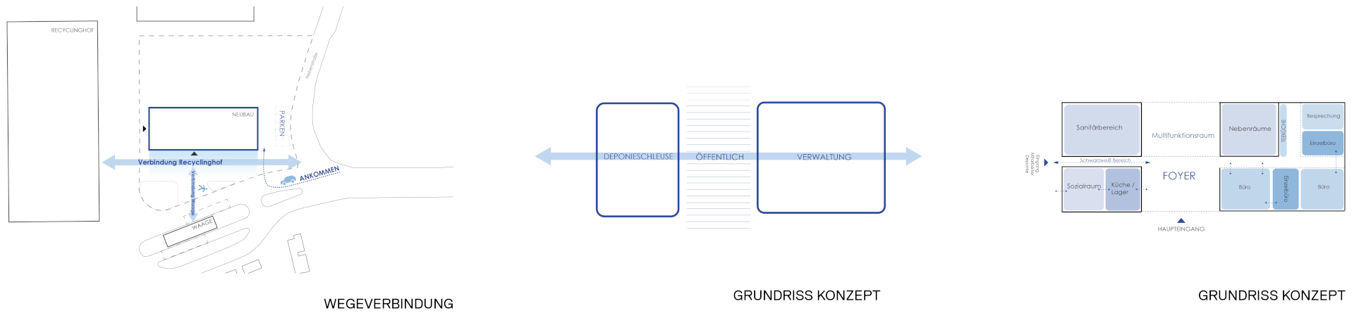 "Die Arbeit ordnet sich am südlichen Rand orthogonal zum Recyclinghof auf dem Baufeld richtig ein. Durch einen angemessen großen Vorplatz, mit genug Abstand zur Einfahrtstraße hin, ist die Adressierung gut gelöst und genügend Platz, sowohl für die Passanten als auch für Besucherparkplätze. Durch den Freiraum ist eine angemessene Geste des Ankommens geschaffen.Der Eingang ist markant durch den großzügigen Rücksprung in der Fassade gekennzeichnet. Das ausreichend bemessene Foyer lässt sich um den Multifunktionsraum erweitern, was bei dem kompakten Baukörper gute Synergien schafft. Die Orientierung des öffentlichen Bereichs auch nach Norden bietet einen schönen Außenbezug.Die innere Raumfolge ist funktional aufgebaut und ermöglicht eine gute Orientierung. Ein separater Eingang für den Arbeiterbereich liegt an der richtigen Stelle und ist ausreichend groß gestaltet, allerdings nicht barrierefrei konzipiert. Die Funktionalität der schwarz-weiß-Bereiche ist allerdings nicht hinreichend aufgezeichnet und wäre zu überprüfen.Die einfache Holzskelettkonstruktion lässt eine wirtschaftliche Bauweise erwarten. Ein enges Raster ermöglicht den Einsatz von Re-Use-Bauteilen in vielfältigen Formaten. Insbesondere die Fassadenelemente sind in Tafelbauweise so konzipiert, dass die Bekleidung eine hohe Variabilität zulassen dürfte.Die VerfasserInnen haben ein wohltuend einfaches Gebäude entwickelt, das gut organisiert und einfach konstruiert ist. Die doch etwas reduzierte Darstellung lässt aber Fragen offen. Inwieweit der Entwurf eines nachhaltigen Gebäudes zu Ende gedacht ist, und inwieweit das Gebäude dem repräsentativen und Beispielhaften Anspruch Rechnung trägt, wird im Preisgericht kritisch diskutiert."