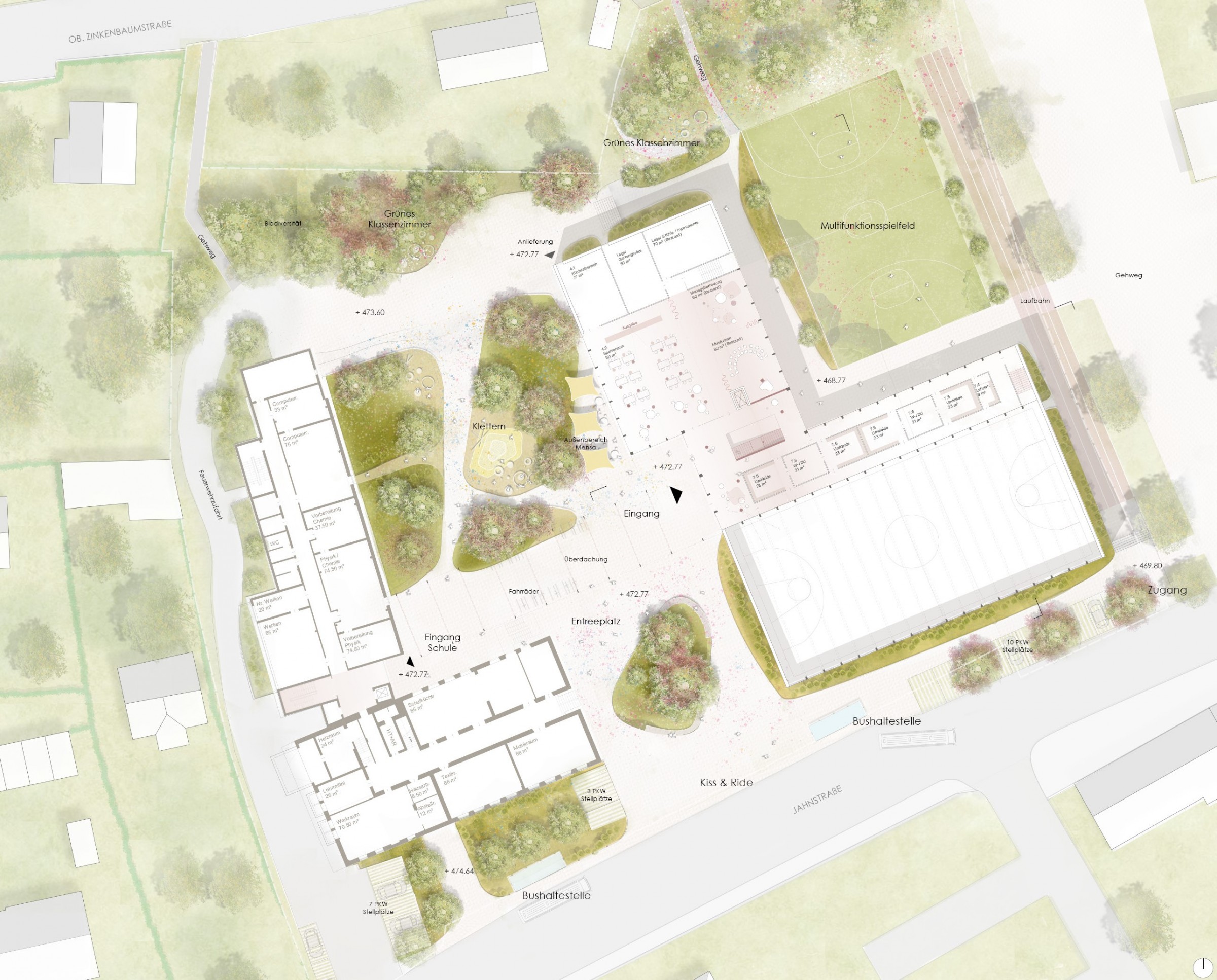 Städtebauliche EinbindungDie Erweiterung der Markus-Gottwald-Schule wird entlang der Jahnstraße, östlich der Bestandsschule, vorgesehen. Dabei gliedert sich der Neubau in zwei Gebäudeteile, einer ein- bis zweigeschossigen Sporthalle und einem zwei- bis dreigeschossigen Mensa- und Ganztagstrakt. Eine einladende Überdachung markiert den Eingangsbereich, zoniert das Schulgelände und verbindet alle Baukörper miteinander. Die städtebauliche Körnung des Neubaus schafft ein in sich verzahnendes Gesamtensemble, in dem sich Neubau und Bestand zu einem gemeinsamen, lebendigen Lernort verbinden. Durch die geschickte Anordnung des Neubaus, dem respektvollen Umgang mit der Bestandsbebauung und die selbstverständliche Einbindung in die Topografie entsteht ein identitätsstiftendes Gesamtensemble mit einem einladenden, wie geschützten Schulgelände - ein lebendiger Lernort, Innen wie Außen.Architektonische und räumliche Qualitäten